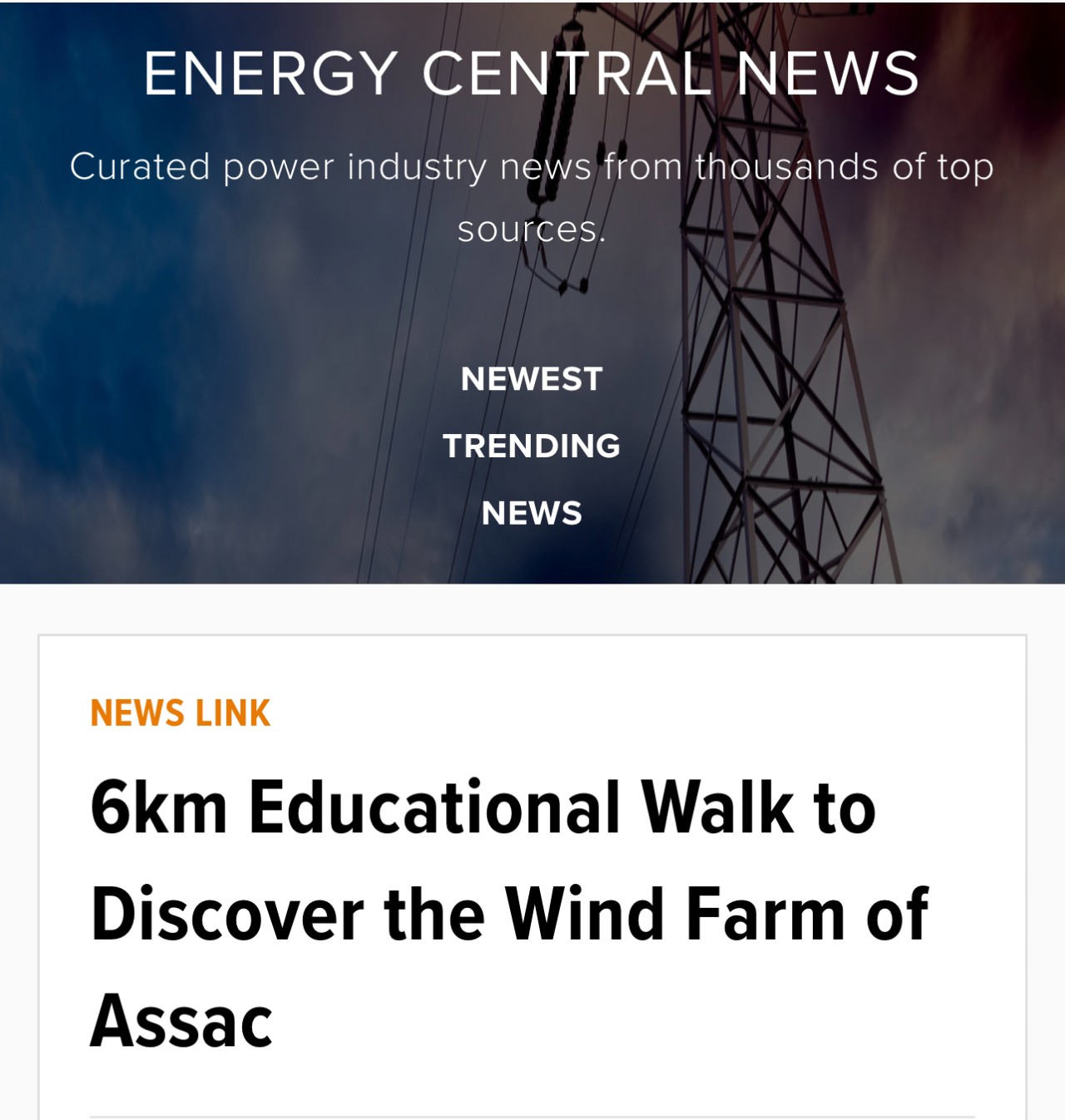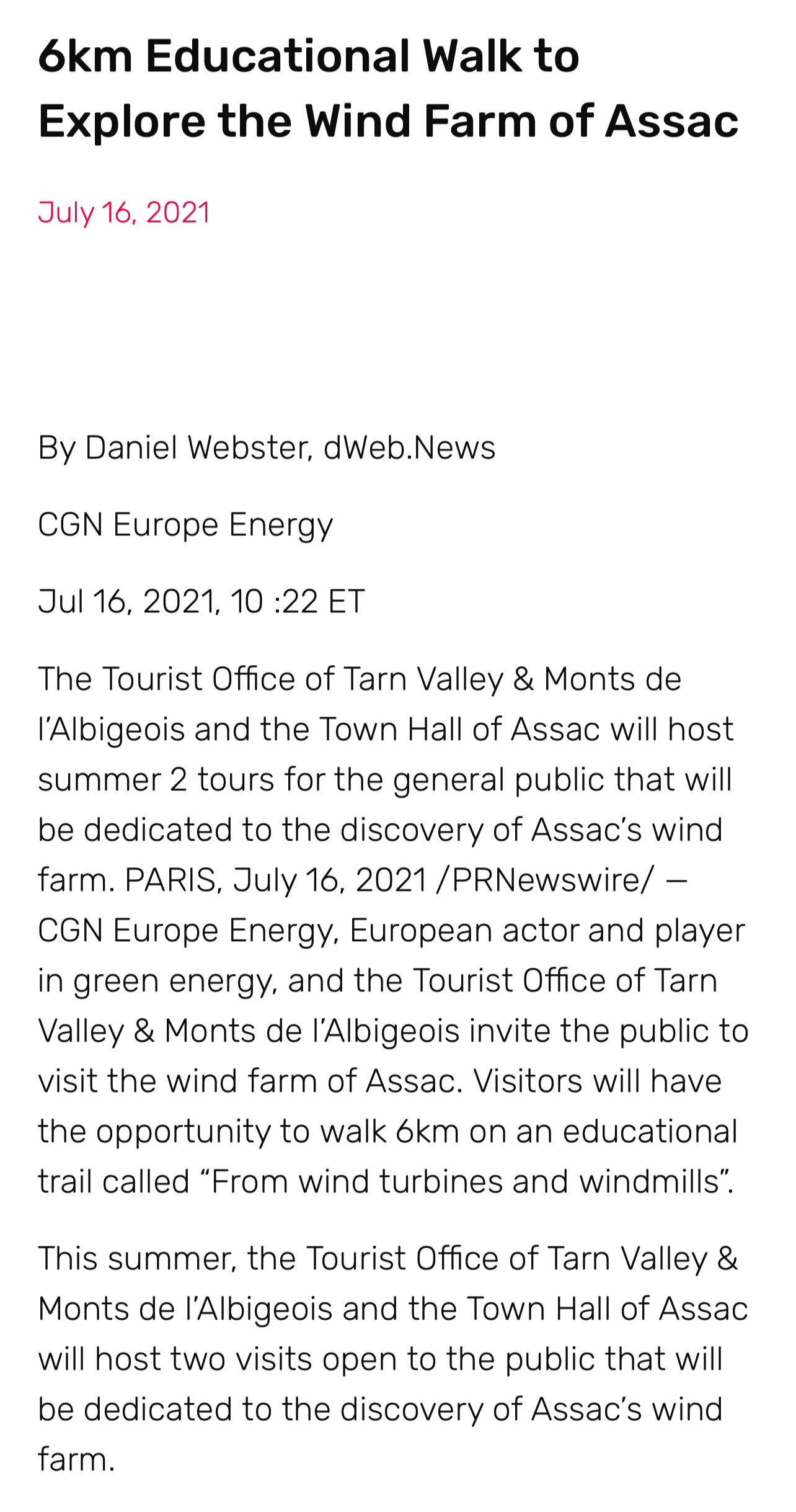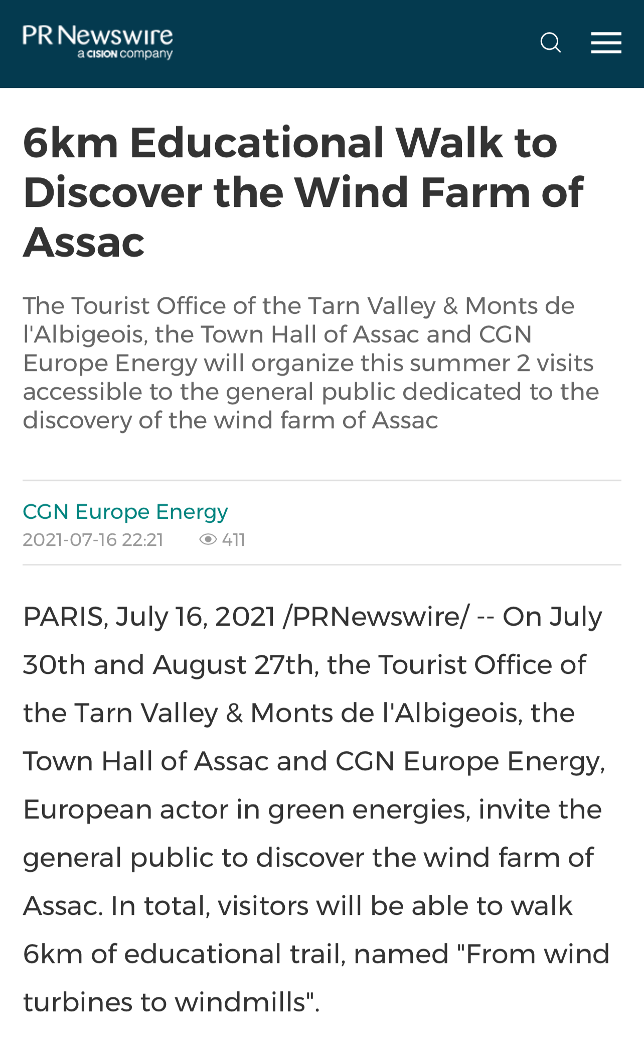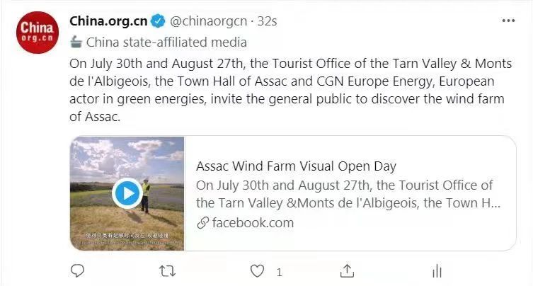英語行業(yè)性媒體《Energy Central News》報(bào)道中廣核歐能公司聯(lián)合塔恩河谷和阿爾比蓋奧山旅游局和Assac市政府將在今年夏天開展的“探索風(fēng)電場”為主題的公益性參觀活動(dòng)。