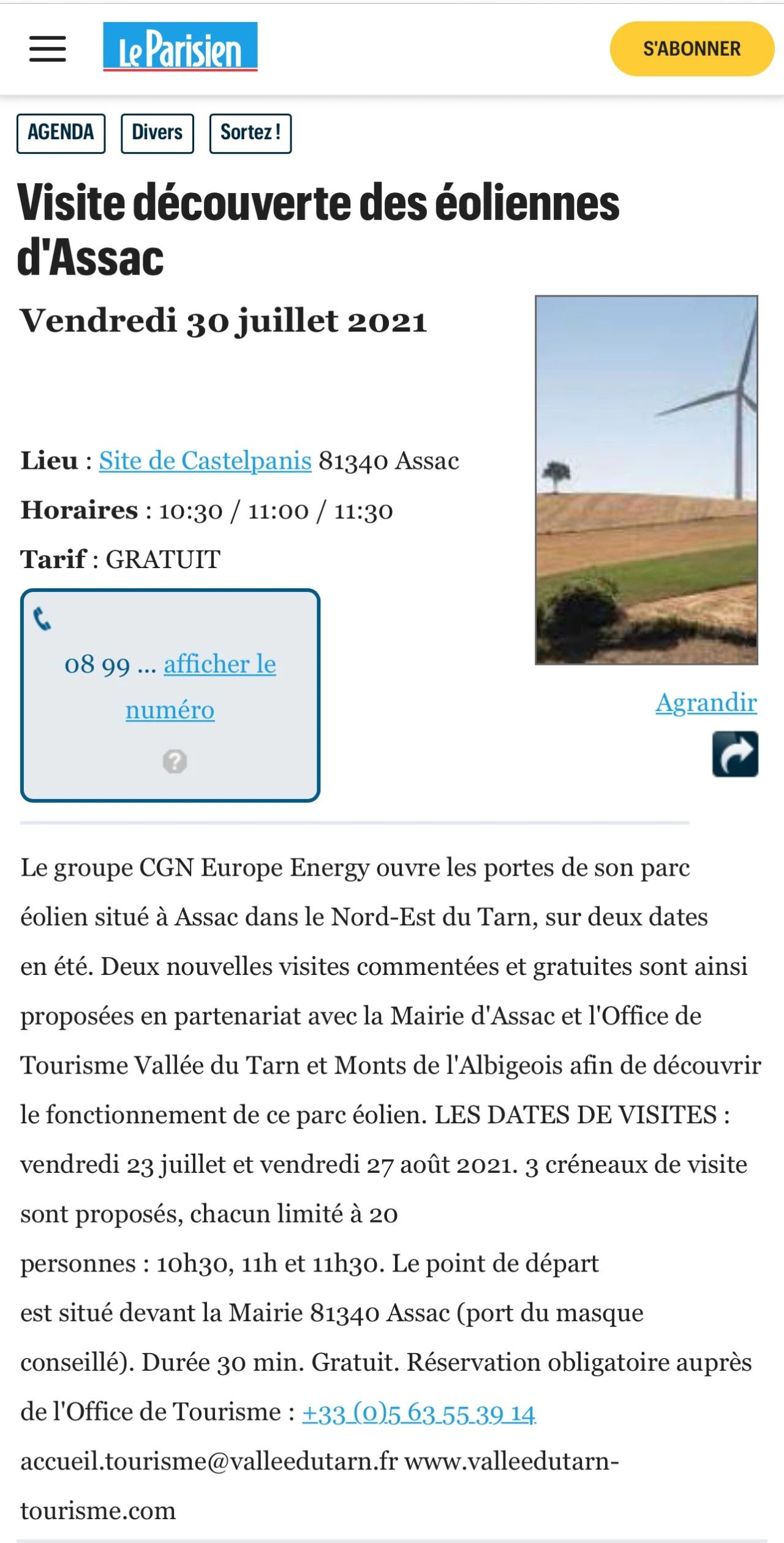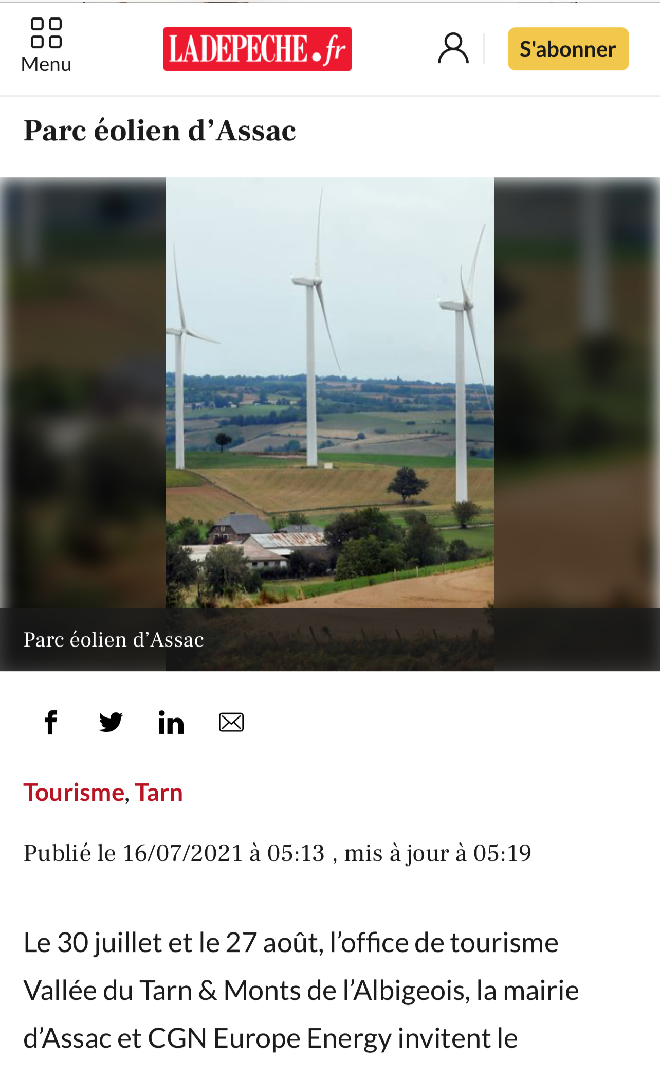 法國旅游網(wǎng)站Losiramag刊登報(bào)道中廣核歐能公司聯(lián)合塔恩河谷和阿爾比蓋奧山旅游局和Assac市政府將在今年夏天開展的“探索風(fēng)電場”為主題的公益性參觀活動(dòng)的旅游信息。