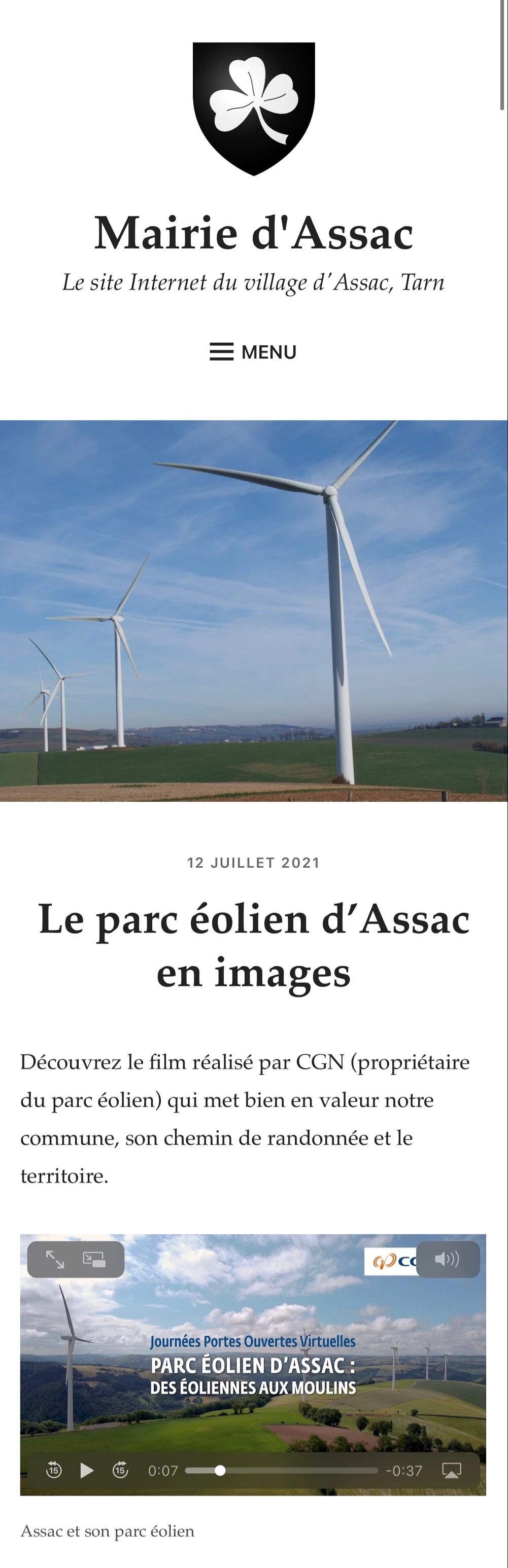 Assac市政府在其官方網(wǎng)站主頁發(fā)布中廣核歐能公司Assac風(fēng)電場介紹,以及此次云開放活動(dòng)的視頻。