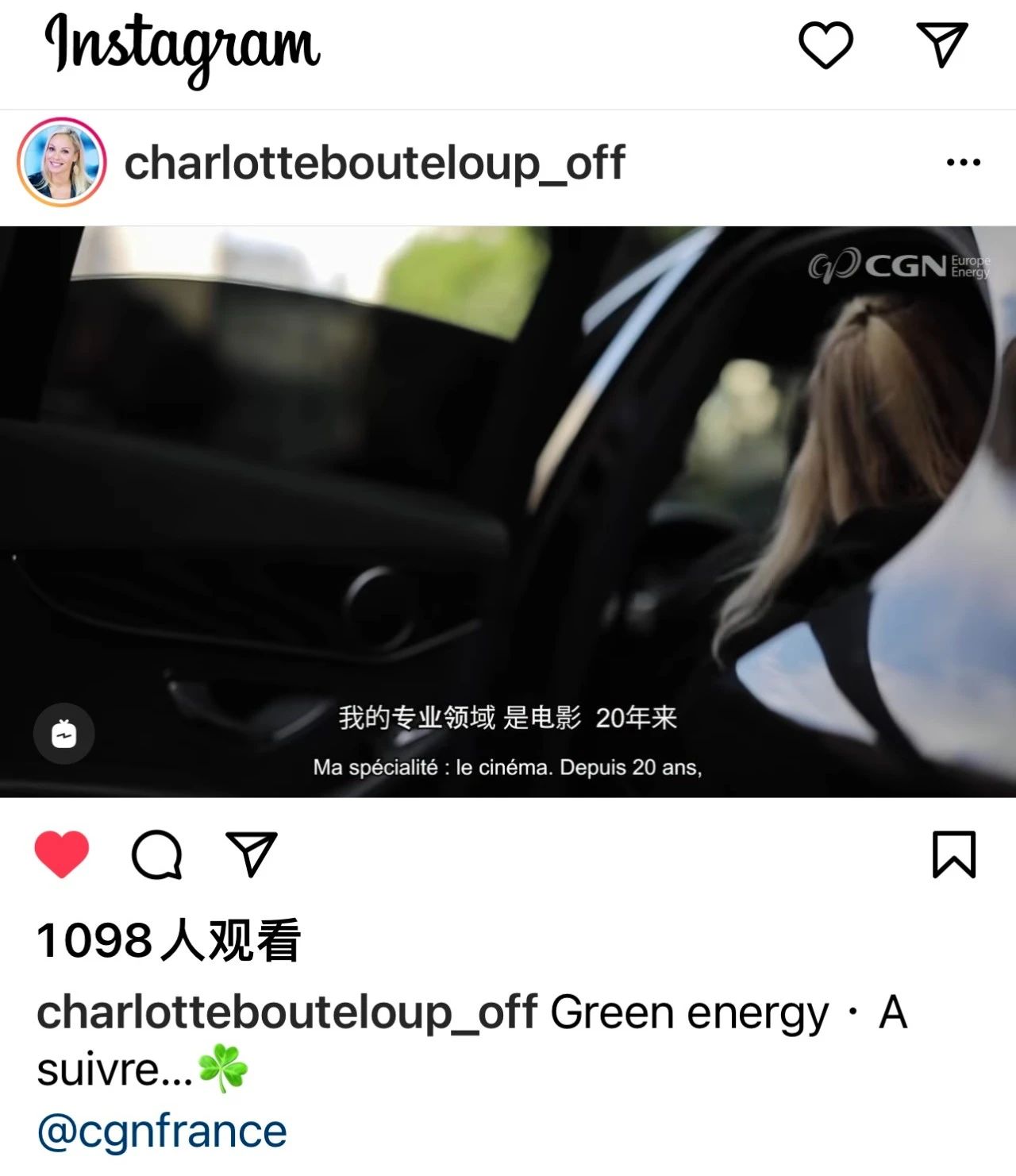法國電視臺(tái)知名主持人夏洛特·布特魯普(Charlotte Bouteloup)與中國廣核集團(tuán)的海外社交媒體賬號聯(lián)動(dòng),在其個(gè)人Instagram和Facebook上發(fā)布活動(dòng)視頻,作為總粉絲量10萬+的大V,其Ins賬戶發(fā)布一小時(shí)內(nèi)觀看人數(shù)上千。