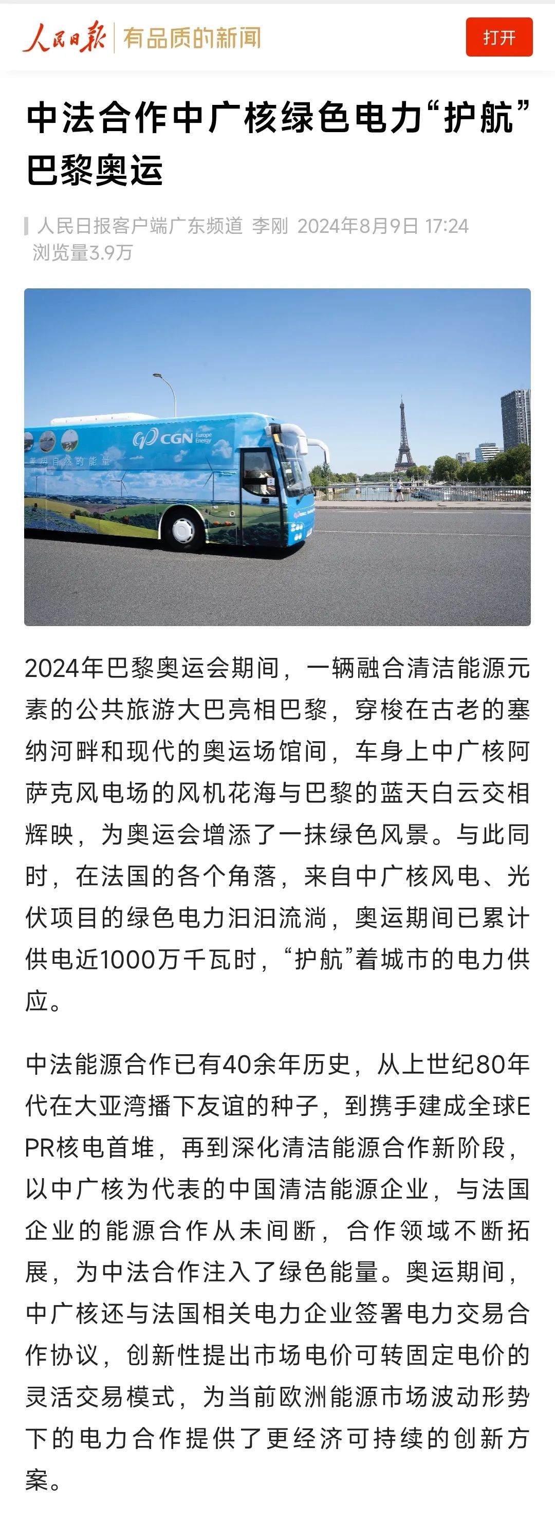 今年是中法建交60周年,能源合作是中法全面戰略伙伴關系的重要組成部分。中法能源合作已有40余年歷史,從上世紀80年代在大亞灣播下友誼的種子,到攜手建成全球EPR核電首堆,再到深化清潔能源合作新階段,以中廣核為代表的中國清潔能源企業,與法國企業的能源合作從未間斷,合作領域不斷拓展,為中法合作注入了綠色能量。奧運期間,中廣核還與法國相關電力企業簽署電力交易合作協議,創新性提出市場電價可轉固定電價的靈活交易模式,為當前歐洲能源市場波動形勢下的電力合作提供了更經濟可持續的創新方案。