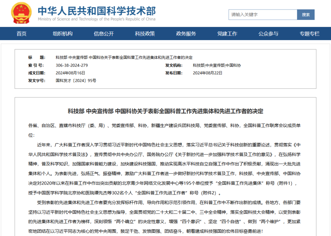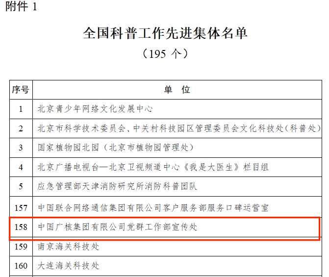 8月22日,科技部、中央宣傳部、中國科協(xié)聯(lián)合發(fā)布《關(guān)于表彰全國科普工作先進(jìn)集體和先進(jìn)工作者的決定》(以下簡稱“決定”),對2020年以來在科普工作中作出突出貢獻(xiàn)的195個單位授予“全國科普工作先進(jìn)集體”稱號。中國廣核集團(tuán)有限公司黨群工作部宣傳處作為國務(wù)院國資委遴選并推薦的兩家單位之一,榮獲“全國科普工作先進(jìn)集體”稱號。