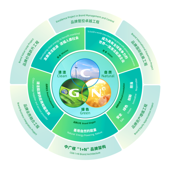 在集團(tuán)母品牌“中廣核”之下,集團(tuán)“1+N”品牌架構(gòu)劃分兩個層級:第一層是下屬企業(yè),采用集團(tuán)主品牌下的單一品牌架構(gòu),充分發(fā)揮“中廣核”母品牌增值帶動作用;第二層是N,即各類產(chǎn)品、服務(wù)采用強(qiáng)背書模式,依托“中廣核”母品牌,著力打造具有市場競爭力的科創(chuàng)產(chǎn)品,增強(qiáng)各類產(chǎn)品和服務(wù)的提質(zhì)反哺作用,凝聚品牌發(fā)展合力。