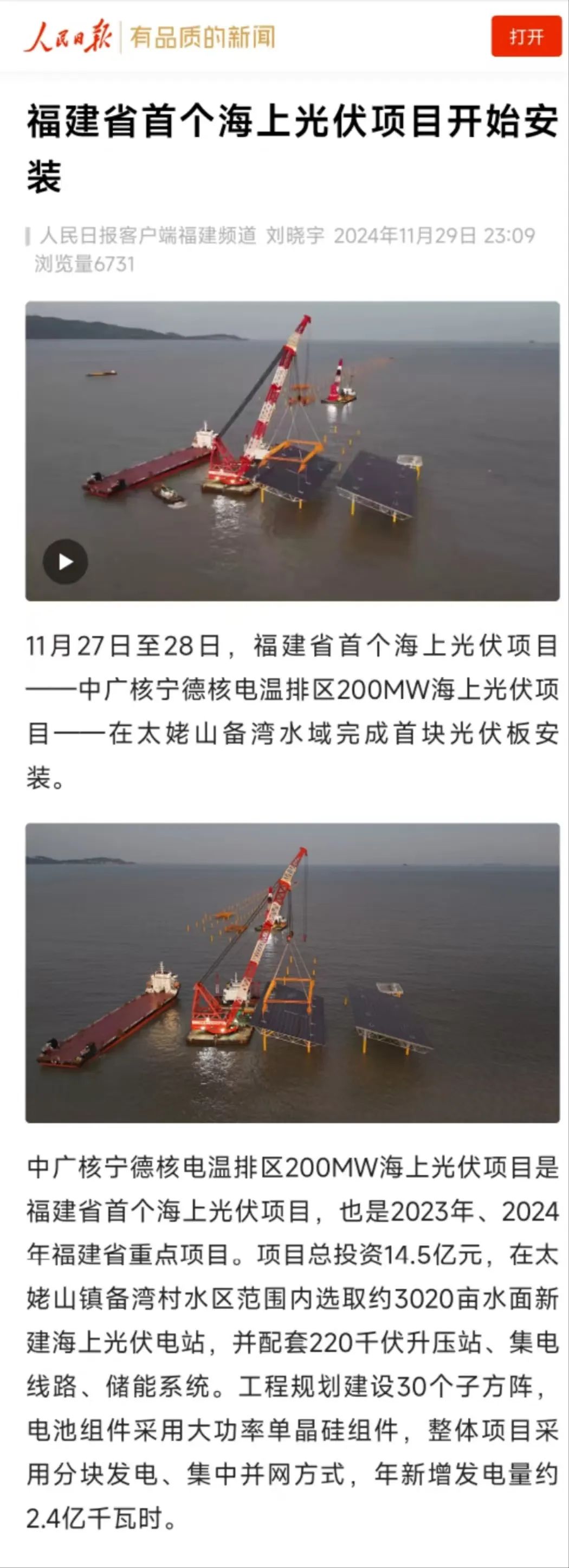 中廣核寧德核電溫排區(qū)200MW海上光伏項(xiàng)目是福建省首個海上光伏項(xiàng)目,也是2023年、2024年福建省重點(diǎn)項(xiàng)目。項(xiàng)目總投資14.5億元,在太姥山鎮(zhèn)備灣村水區(qū)范圍內(nèi)選取約3020畝水面新建海上光伏電站,并配套220千伏升壓站、集電線路、儲能系統(tǒng)。工程規(guī)劃建設(shè)30個子方陣,電池組件采用大功率單晶硅組件,整體項(xiàng)目采用分塊發(fā)電、集中并網(wǎng)方式,年新增發(fā)電量約2.4億千瓦時。