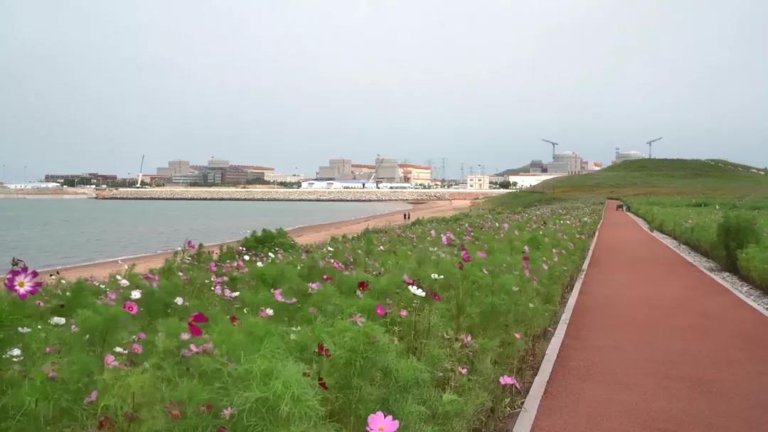 ▲紅沿河核電基地直播現場,格桑花海與遠處的核電機組遙相呼應
